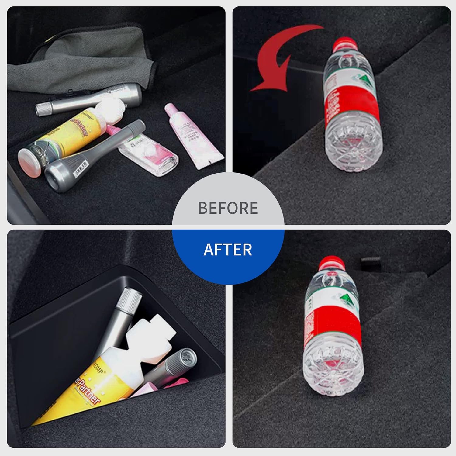 2. MAX STORAGE SPACE: Model y rear trunk organizer storage boxes help keep your trunk organized and clean; The side storage bins slip into the left and right trunk pockets allowing you to stow shoes, tools, gear and other items that might otherwise dirty your trunk's interior; Perfect storage space!